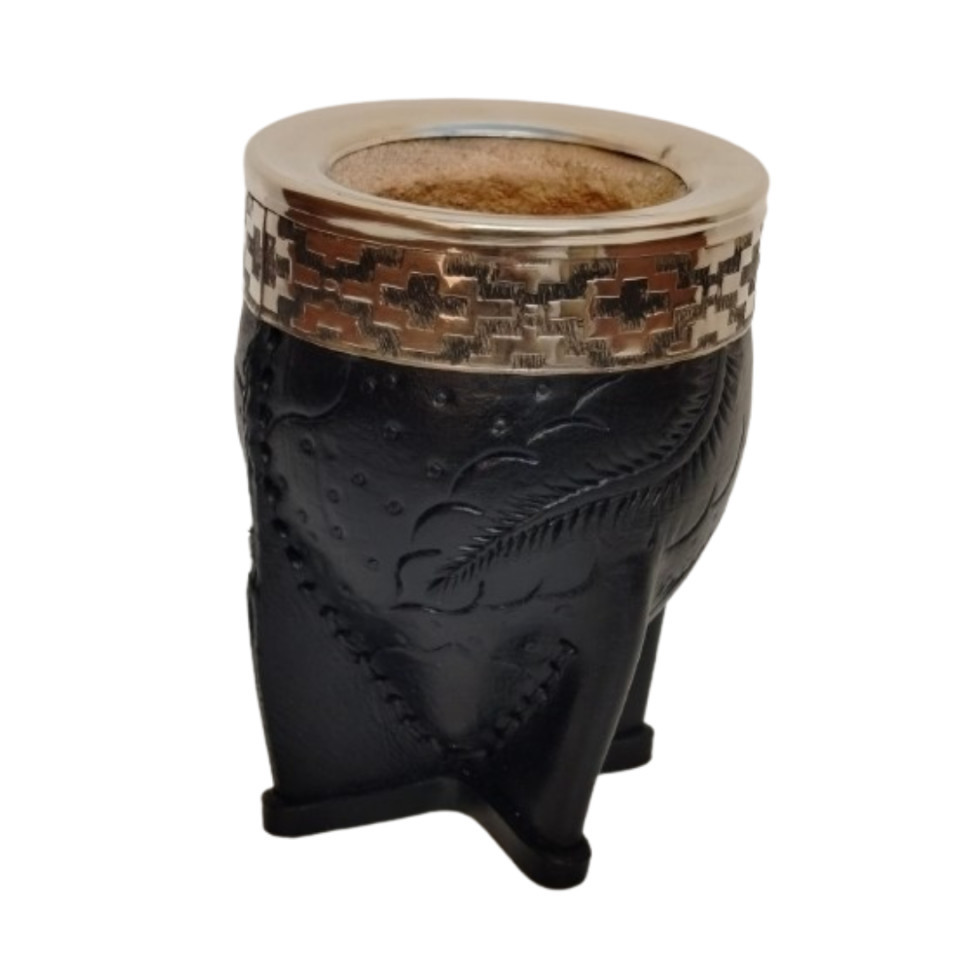 Mate Imperial de Cuero Repujado Negro c /Virola de Acero Inoxidable Lisa y Fleje de Alpaca Labrado