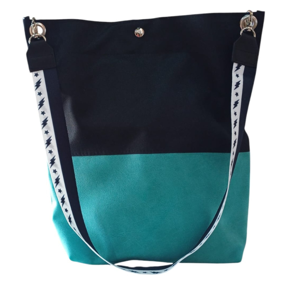 CARTERA CON TIRAS COLOR combinado con cuerina color negro y Aqua (el material de las telas es cordura y cuerina)