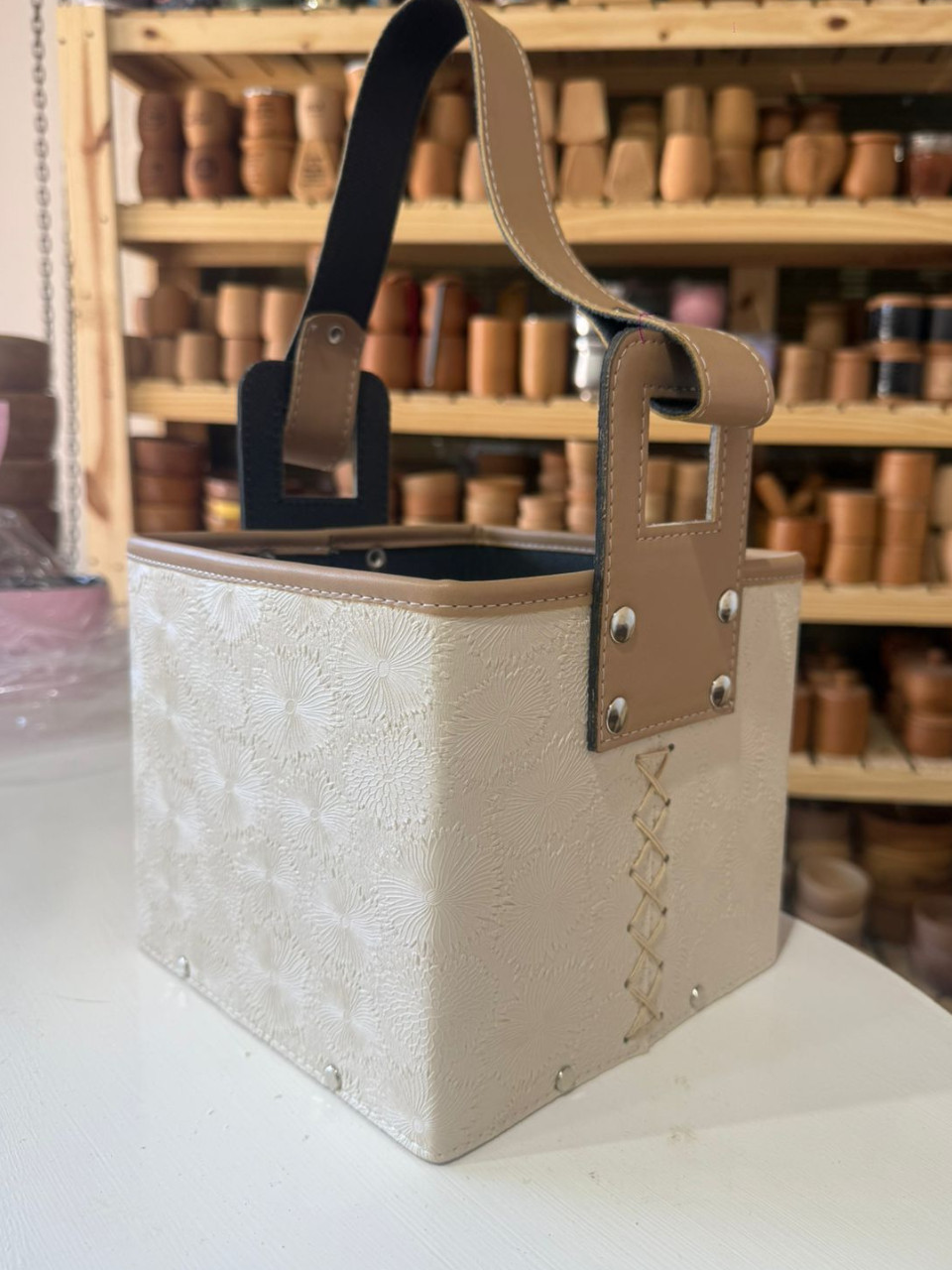 Bolso Matero Portatermo Canasta Cuadrada De Color Natural C/ Costura Diseño Flor