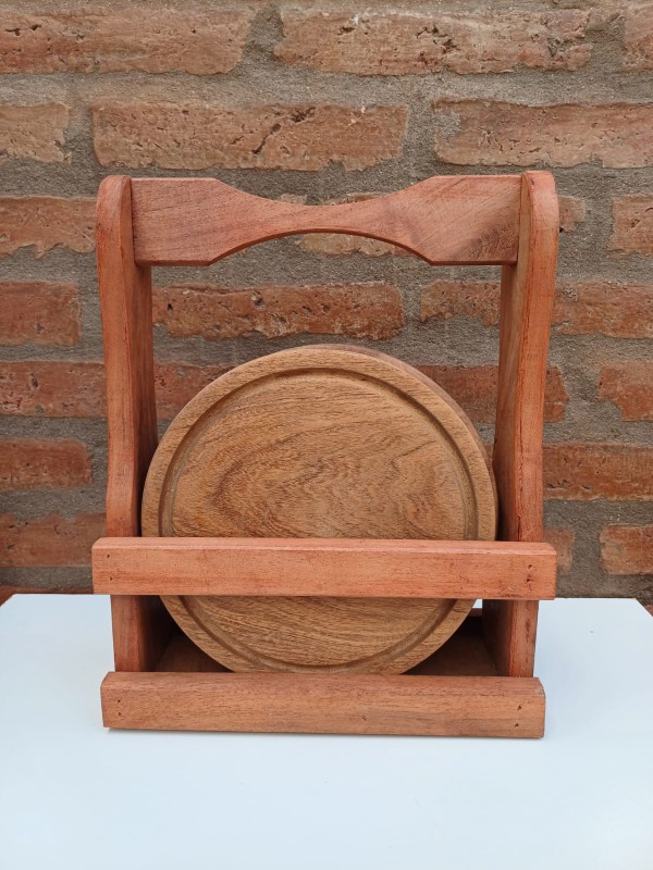 1 porta platos de madera algarrobo, con manija, medidas 34 cm de alto x 27 cm ancho.